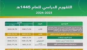 يتكون التقويم الدراسي للعام 1445 من 3 فصول دراسية، تتضمن 38 أسبوعًا تقريبًا وحوالي 180 يومًا دراسيًا. تشمل الإجازات 60 يومًا، بما في ذلك 10 أيام من الإجازات المطولة و68 يومًا من أيام الإجازة الصيفية، ويُعاد بدء الدراسة خلال شهر رمضان مع إجازة عيد الفطر، تليها فترة دراسية تصل إلى ثلاثة أسابيع، تتضمن الخطة أيضًا إجازات أسبوعية مطولة تمتد من الخميس حتى السبت.
