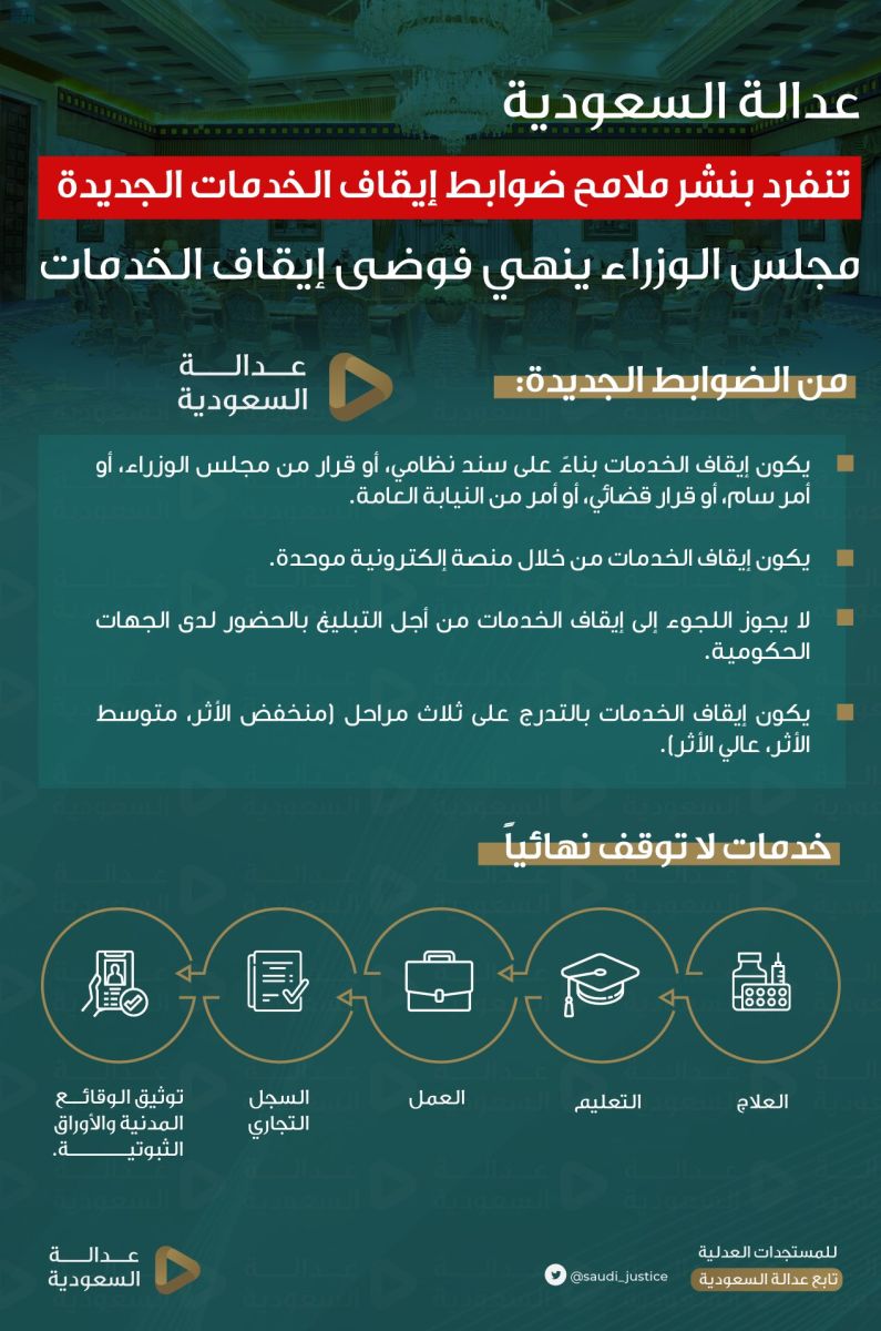 - يتم إصدار قرار إيقاف الخدمات من خلال قرار نظامي أو إداري أو قضائي أو نظامي من مجلس الوزراء.
