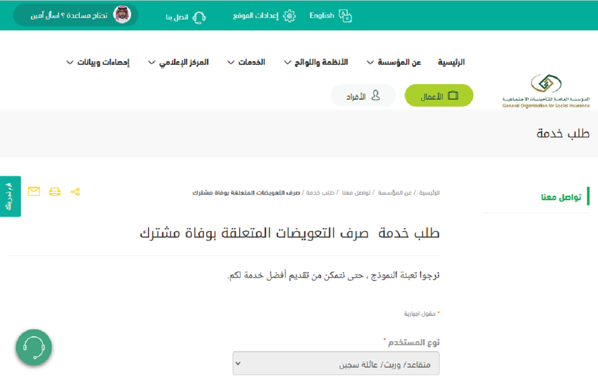 تقدم المؤسسة العامة للتأمينات الاجتماعية في المملكة العربية السعودية خدمة إلكترونية لصرف التعويضات لأفراد عائلة المشترك/المتقاعد المتوفى، مما يتيح لهم تقديم الطلبات بشكل إلكتروني دون الحاجة لمراجعة الفرع.