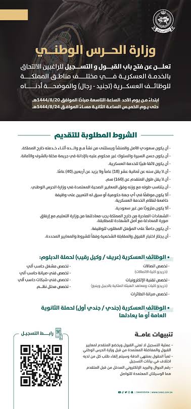 أما بالنسبة لشروط القبول في الحرس الوطني، فتتضمن معايير محددة للمتقدمين، مثل الجنسية السعودية، وعمر يتراوح بين 18 و 60 عاماً، وحصول المتقدم على المؤهل الدراسي المطلوب، كما يجب أن يكون المتقدم حسن السيرة والسلوك والسمعة الطبية، وألا يقل طوله عن 160 سم، بالإضافة إلى مطابقته لضوابط الوزن المحددة.