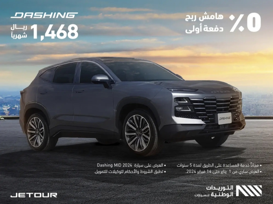 سيارة جيتور Dashing 2024 Comfort: بقسط شهري 1,468 ريال سعودي بدون هامش ربح، مع خدمة المساعدة على الطريق لمدة 5 سنوات، وموتور بنزين تيربو بقوة 154 حصان، وسعة 1.5 لتر، وخزان وقود سعة 55 لتر، مع دفع أمامي وناقل حركة أوتوماتيك.