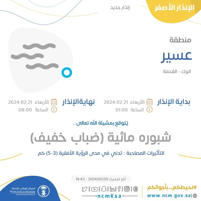 - تستمر حالة شبورة مائية تعيق الرؤية الأفقية في عسير ومكة المكرمة حتى الساعة الثامنة من صباح يوم غد الأربعاء، وحتى الساعة التاسعة على الحدود الشمالية.