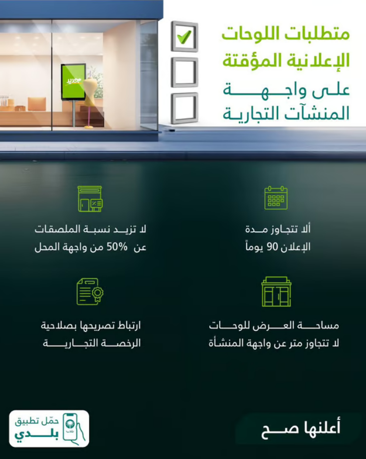 مساحة اللوحة الإعلانية: يجب ألا تتجاوز مساحة اللوحة الإعلانية 50% من مساحة واجهة المحل.