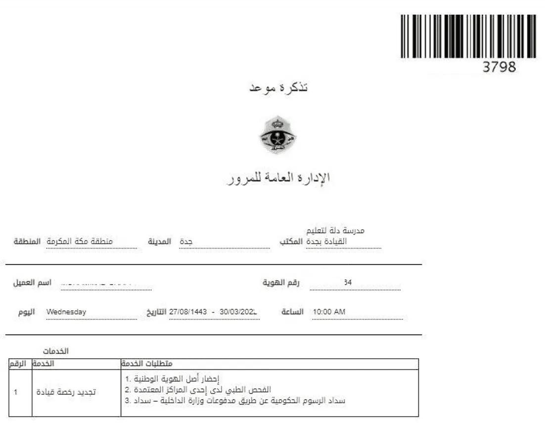اكتب جميع المعلومات الخاصة بالمواعيد التي تريد حجزها في المرور، واكتب المعلومات في مكانها المخصص.