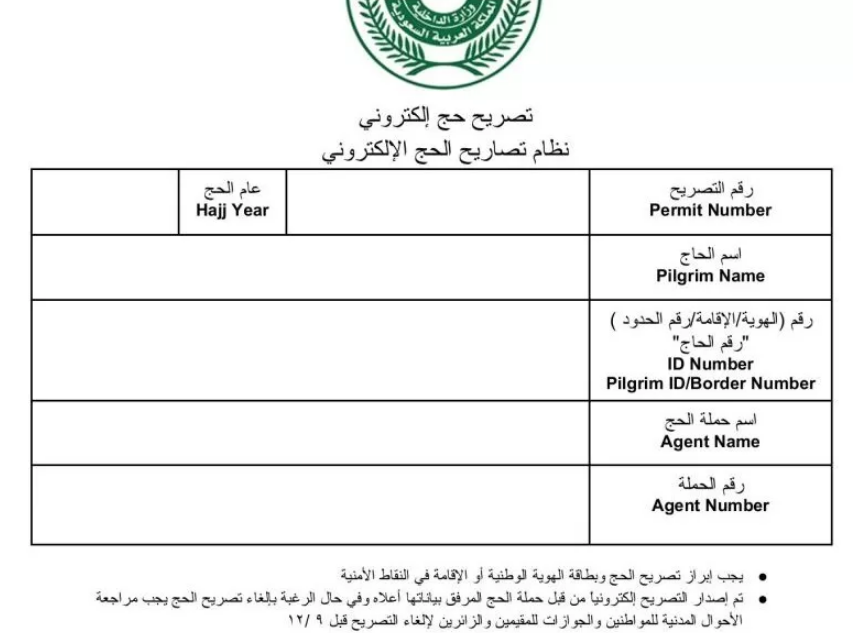 نموذج تصريح الحج هو نموذَج إلكتروني خاص بالمواطنين السعوديين والأجانب المقيمين داخل المملكة، وهو مُعد للطباعة بشكل فوري، ويمكن تحميل النموذج من هنا، ومن الجدير بالذكر أنه لا يمكن كتابة بيانات النموذج بشكل يدوي، وتتم طباعة النموذج عن طريق تطبيق أبشر للحاج أو لأحد تابعيه، ويحتوي على البيانات التالية (اسم الحاج، رقم التصريح، رقم الهوية أو الإقامة، رقم الهاتف، سنة الحج، الحدود، اسم حملة الحج، رقم الحملة).