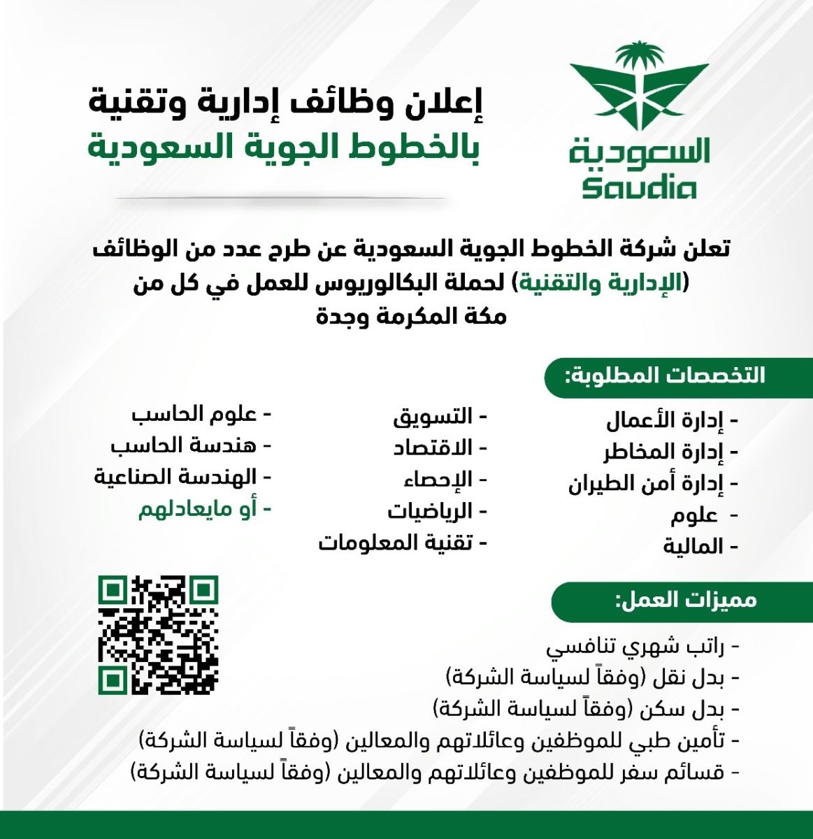 يسر شركة الخطوط الجوية الإعلان عن فرص عمل مثيرة في مدينتي مكة المكرمة وجدة في الوظائف الإدارية والتقنية لحملة البكالوريوس.