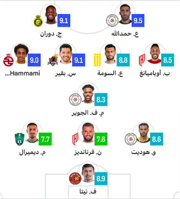 إلى جانبه، تواجد جون دوران من النصر بتقييم 9.1، ليشكل ثنائيًا هجوميًا مميزًا في التشكيلة المثالية.
