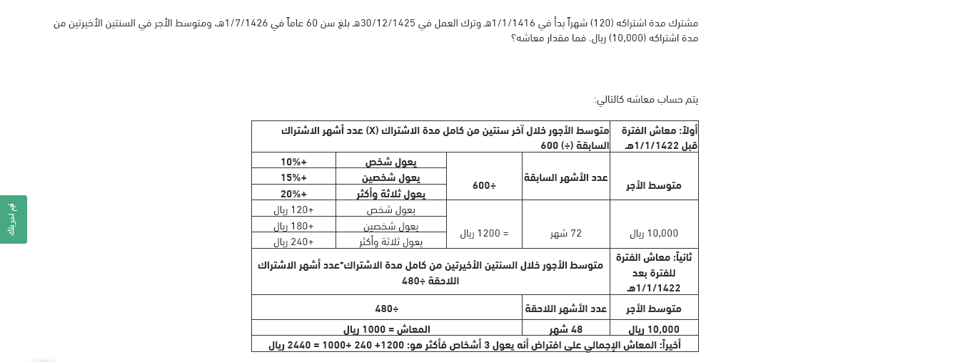 حساب معاش الفترة بعد 1/1/1422هـ: (متوسط الأجور خلال آخر عامين × عدد أشهر الاشتراك اللاحقة ÷ 480)