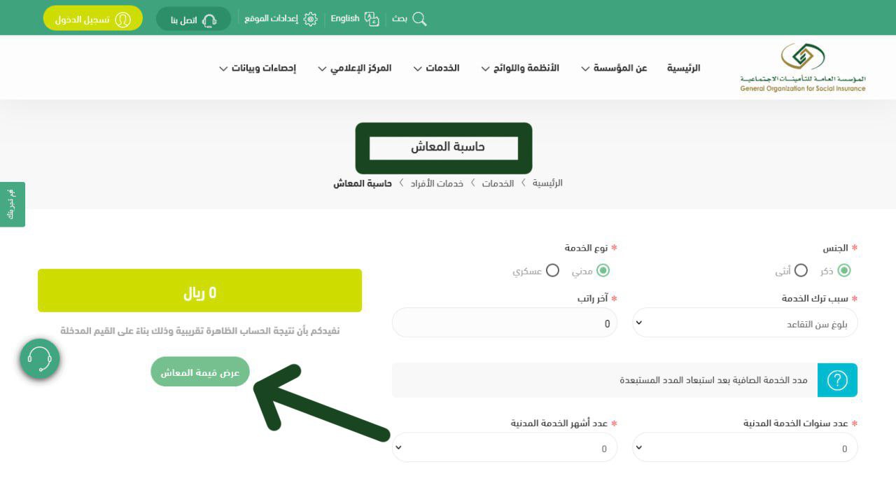 - النقر على زر "عرض قيمة المعاش" للحصول على القيمة التقديرية للمعاش التقاعدي المتوقع.