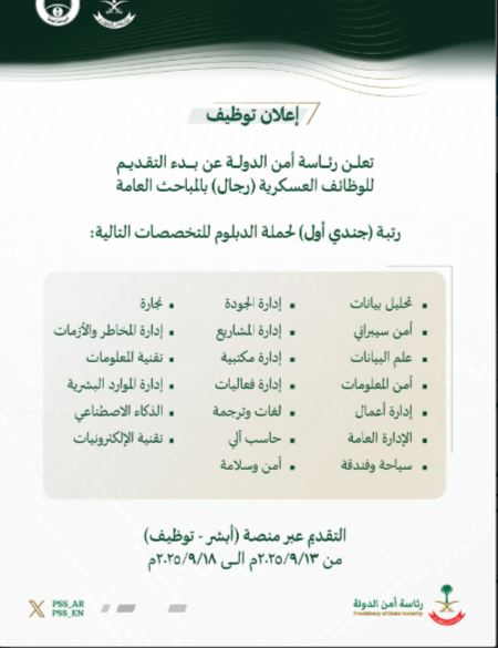 في خطوة تهدف إلى استقطاب الكفاءات الوطنية وتعزيز حضور الشباب السعودي في القطاعات الأمنية المتخصصة، أعلنت رئاسة أمن الدولة عن فتح باب القبول والتسجيل لشغل وظائف عسكرية على رتبة "جندي أول" في قطاع المباحث العامة.