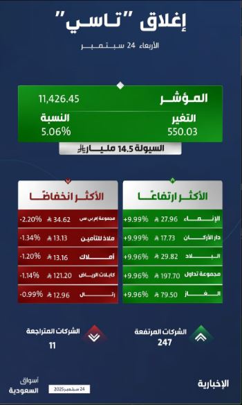وفق النشرة الاقتصادية اليومية، سجل المؤشر ارتفاع بمقدار 550.03 نقطة، ليصل إلى مستوى 11,426.45 نقطة، بينما بلغت قيمة التداولات الإجمالية 14.4 مليار ريال سعودي.