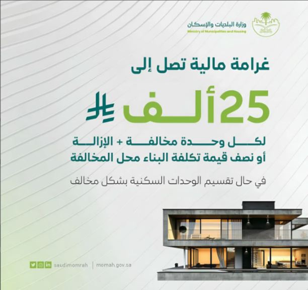 وقد حددت اللائحة غرامات مالية تتراوح بين خمسة آلاف وخمسة وعشرين ألف ريال عن كل وحدة مخالفة، إضافة إلى إلزام المالك أو المنفذ بإزالة المخالفة على نفقته الخاصة.